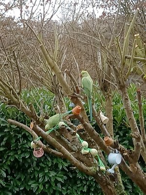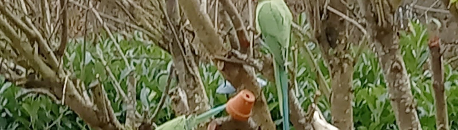 Depuis quelques semaines, des dizaines de perruches à collier ont été aperçues dans la commune, notamment proches des lotissements. Un habitant du Clos du Moulin raconte en avoir compté 14 spécimens dans son jardin, occupées à manger les boules de graisse accrochées à ses arbres pour nourrir les oiseaux.
