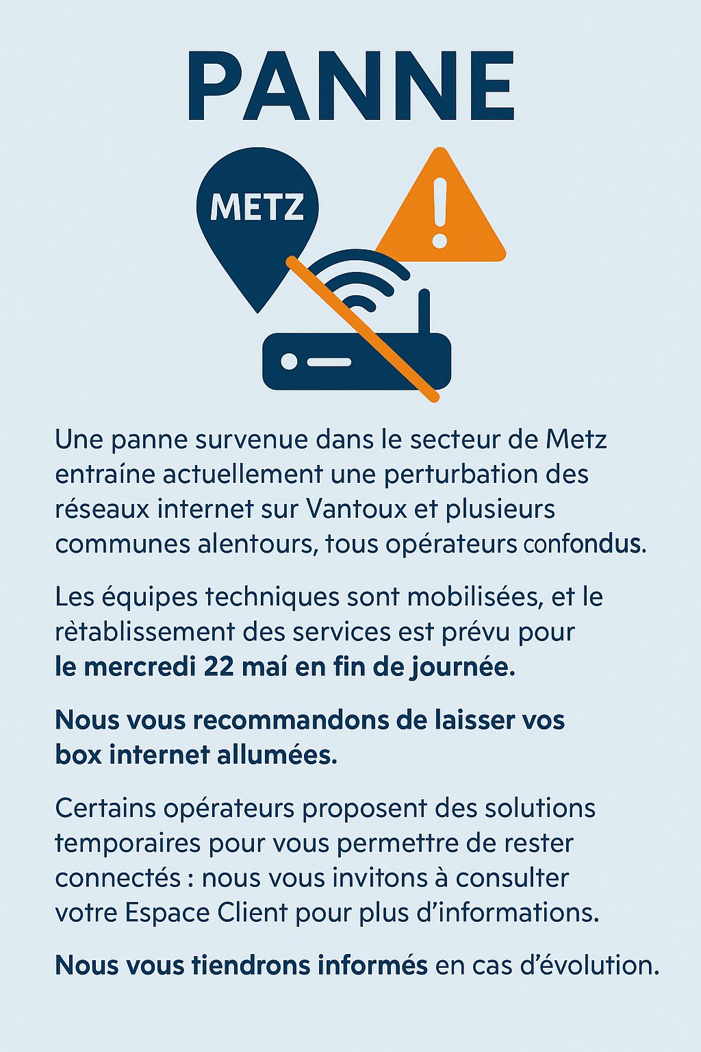Une panne survenue dans le secteur de Metz entraîne actuellement une perturbation des réseaux internet sur Vantoux et plusieurs communes alentours, tous opérateurs confondus. Les équipes techniques sont mobilisées, et le rétablissement des services est prévu pour le mercredi 22 mai en fin de journée. Nous vous recommandons de laisser vos box internet allumées. Certains opérateurs proposent des solutions temporaires pour vous permettre de rester connectés : nous vous invitons à consulter votre Espace Client pour plus d’informations. Nous vous tiendrons informés en cas d’évolution.