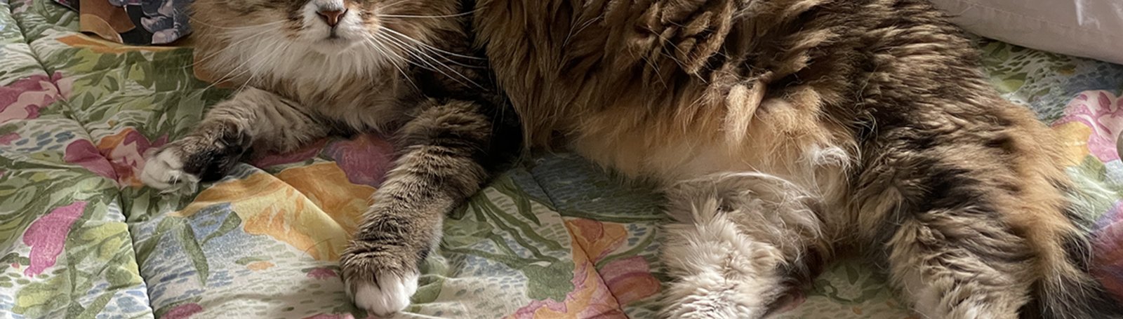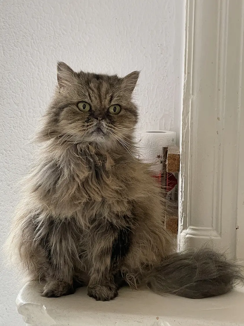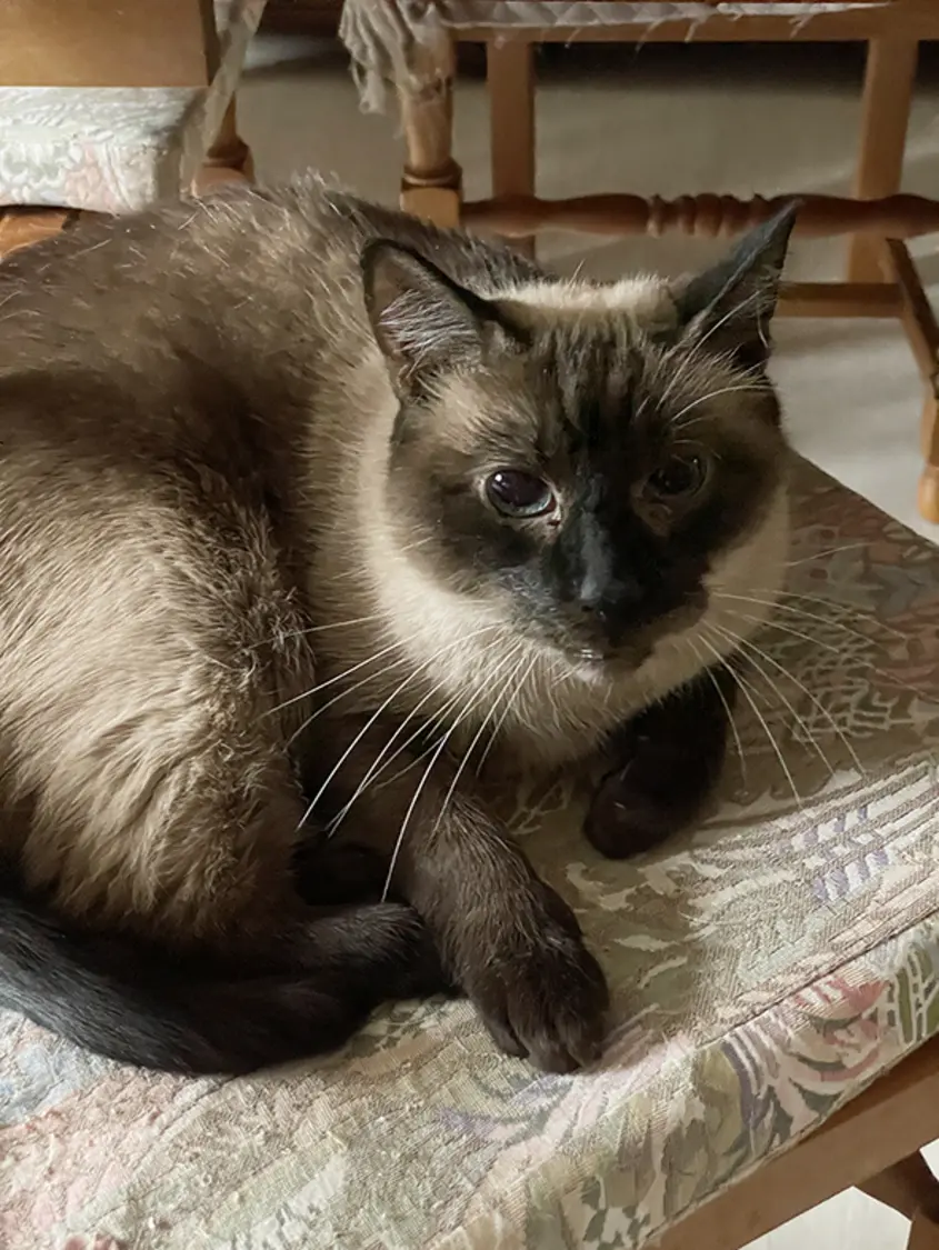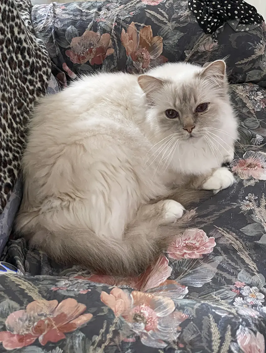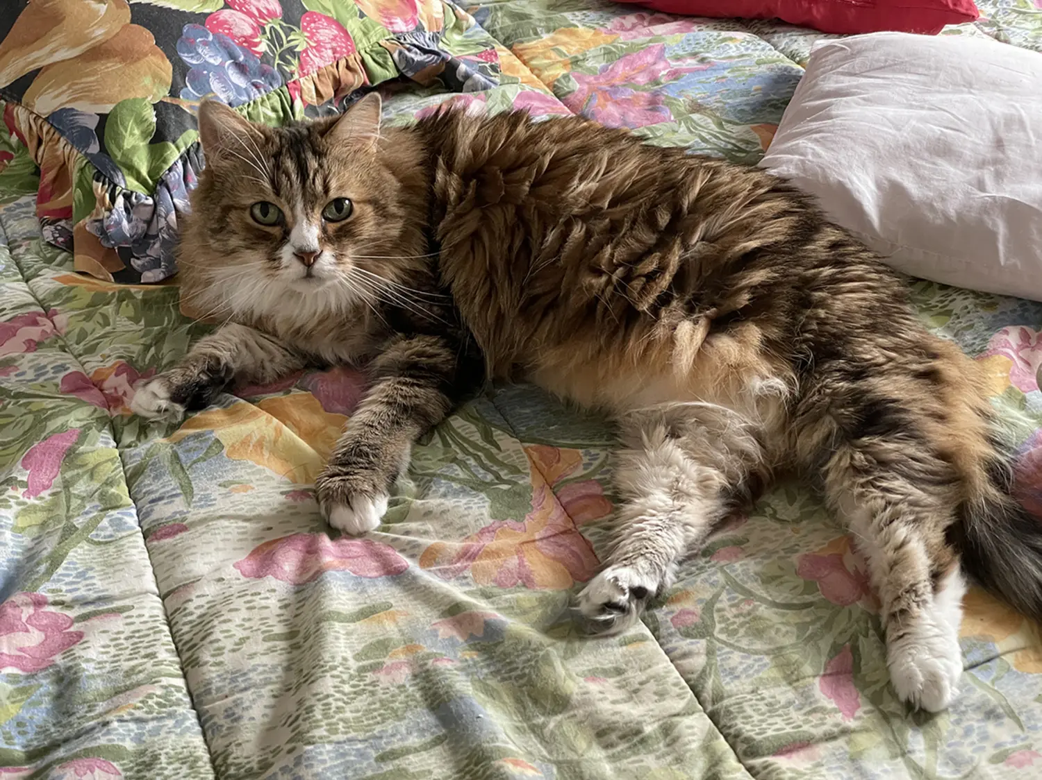 « Habitant à l’étage, je suis obligée de les garder enfermés, sinon ils se sauveraient et risqueraient d’être écrasés, car mon appartement borde une route fréquentée. La nuit, seuls deux de mes chats et ma petite chienne Flora sont autorisés à dormir avec moi. »
