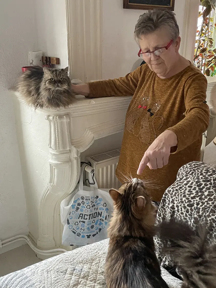 « J’ai travaillé comme secrétaire de l’association Les Félins de Malroy, qui s’occupe de chats errants ou abandonnés, jusqu’à ce que des soucis de santé m’obligent à cesser cette activité. J’en ai accueilli jusqu’à vingt chez moi et j’ai aussi sauvé la vie de beaucoup d’autres. »