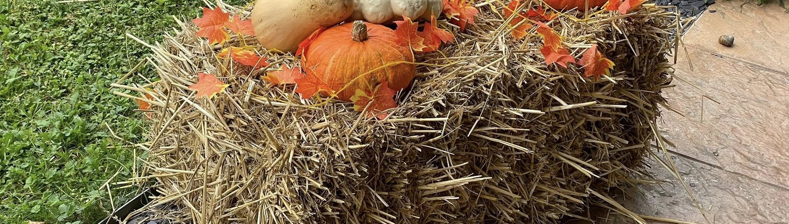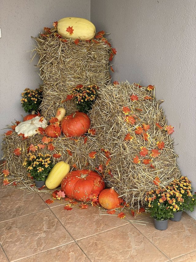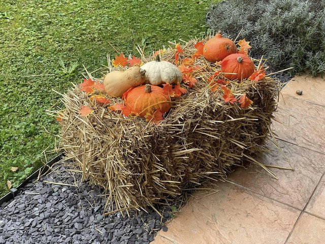 Impasse du Clos du Moulin également, Jennyfer a été très inspirée pour décorer l'entrée de son habitation. Une base de bottes de paille recouvertes d'une multitude de cucurbitacées colorées, de petits pots de fleurs et de feuilles judicieusement disposées composent un ensemble plein de charme.
