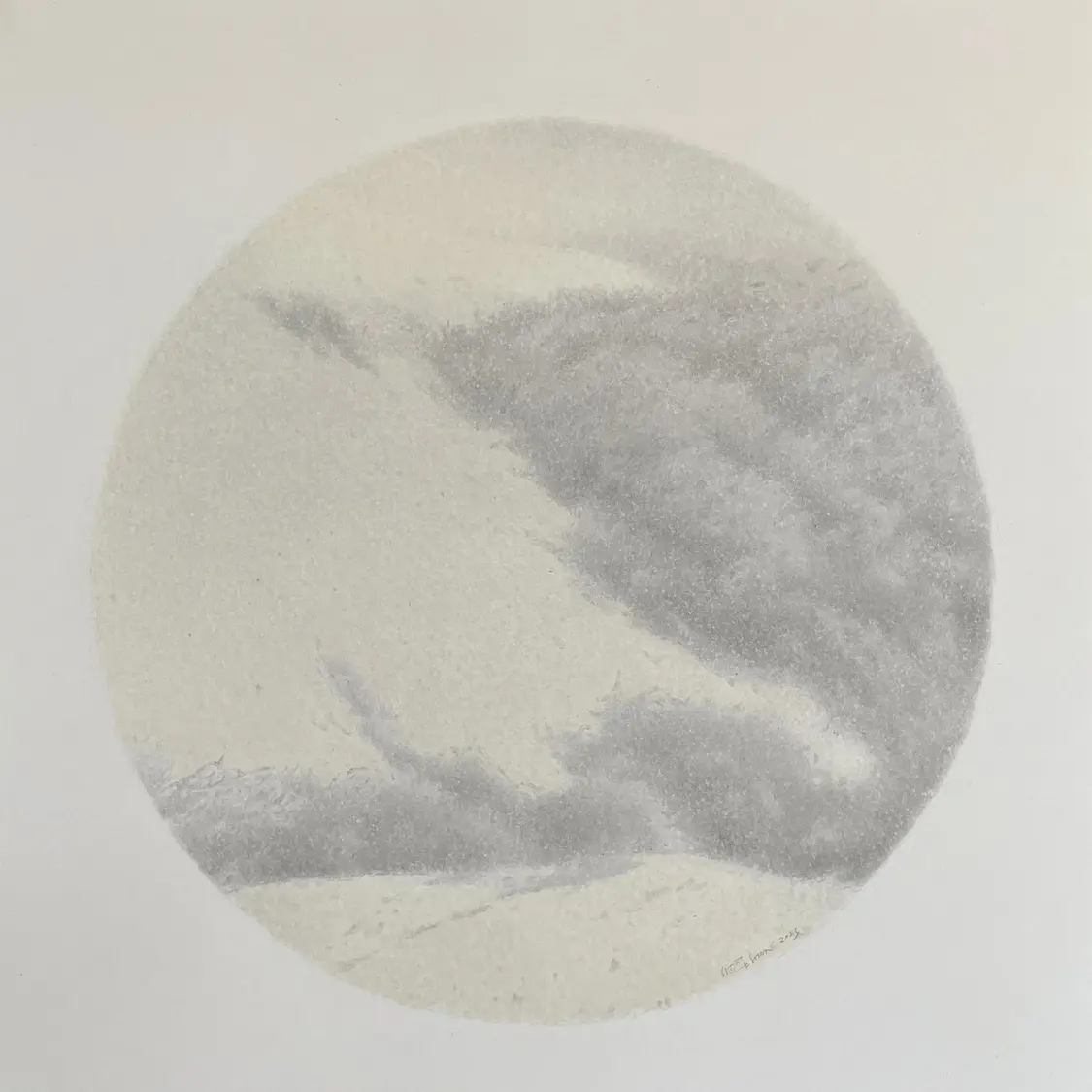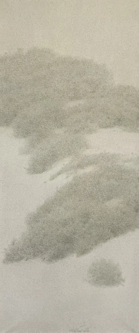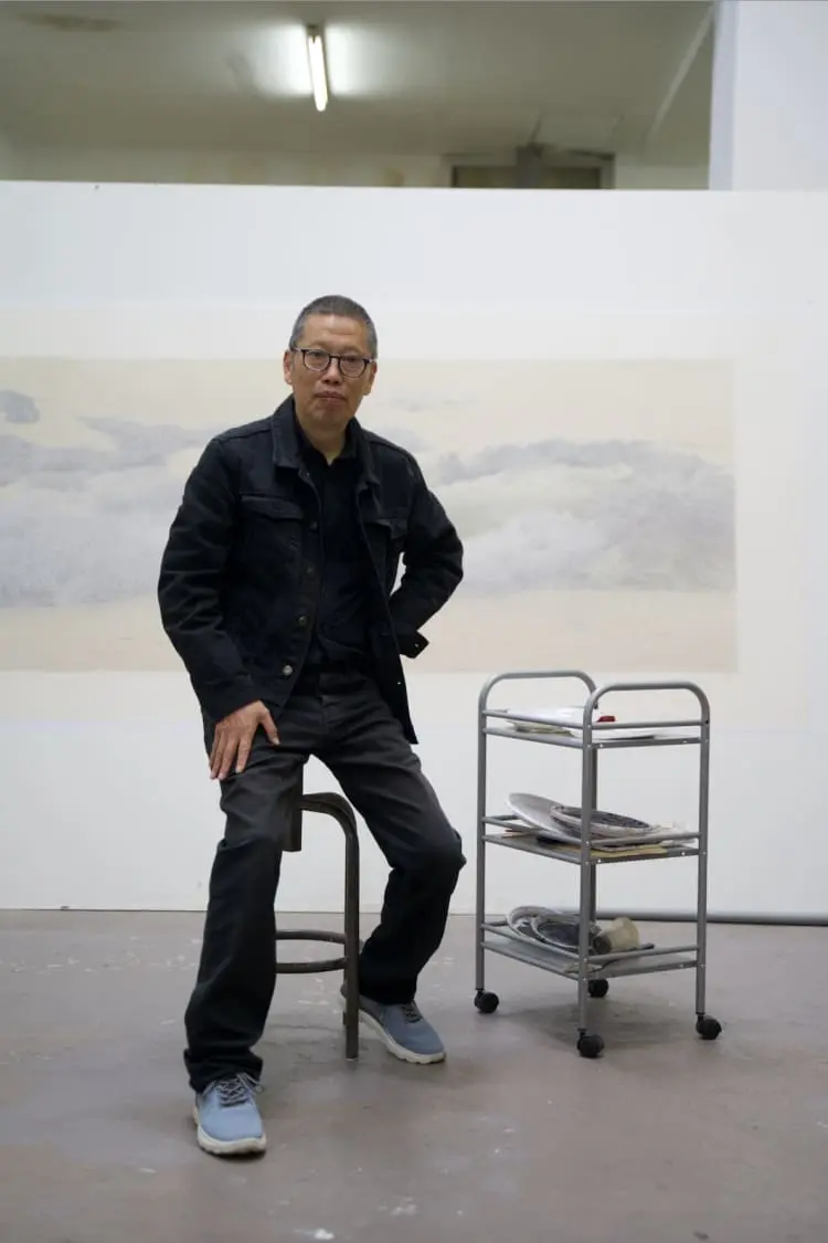 Utilisant principalement les outils traditionnels de la peinture — papier de riz, pinceau et encre — il superpose de délicates nuances d’encre, créant un paysage suburbain riche et subtil.