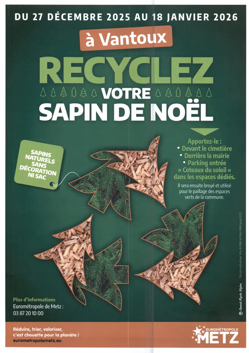 Du 27 décembre 2025 au 18 janvier 2026 La commune de Vantoux propose une opération de recyclage des sapins de Noël.