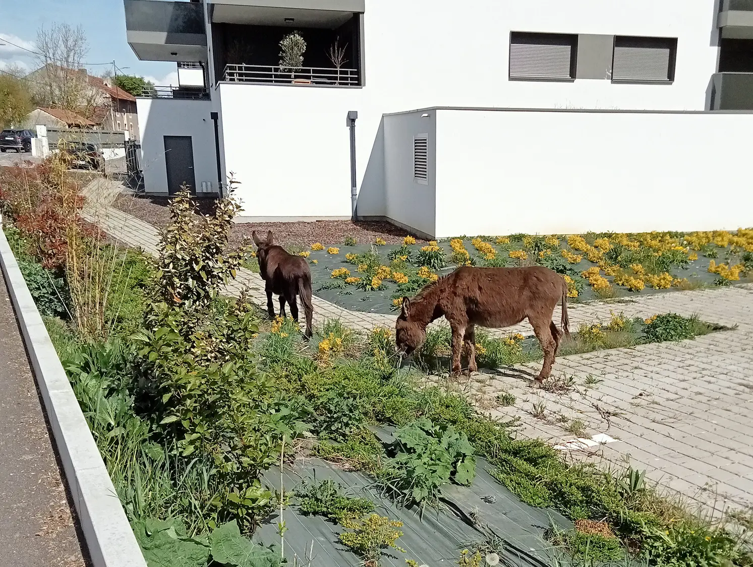 Au grand étonnement des résidents des résidences Arborea et des passants, un couple d’ânes, qui s’était échappé de leur enclos situé de l’autre côté du ruisseau, côté Vallières, s’est baladé tranquillement dans les zones vertes qui bordent les résidences, broutant ici et là…