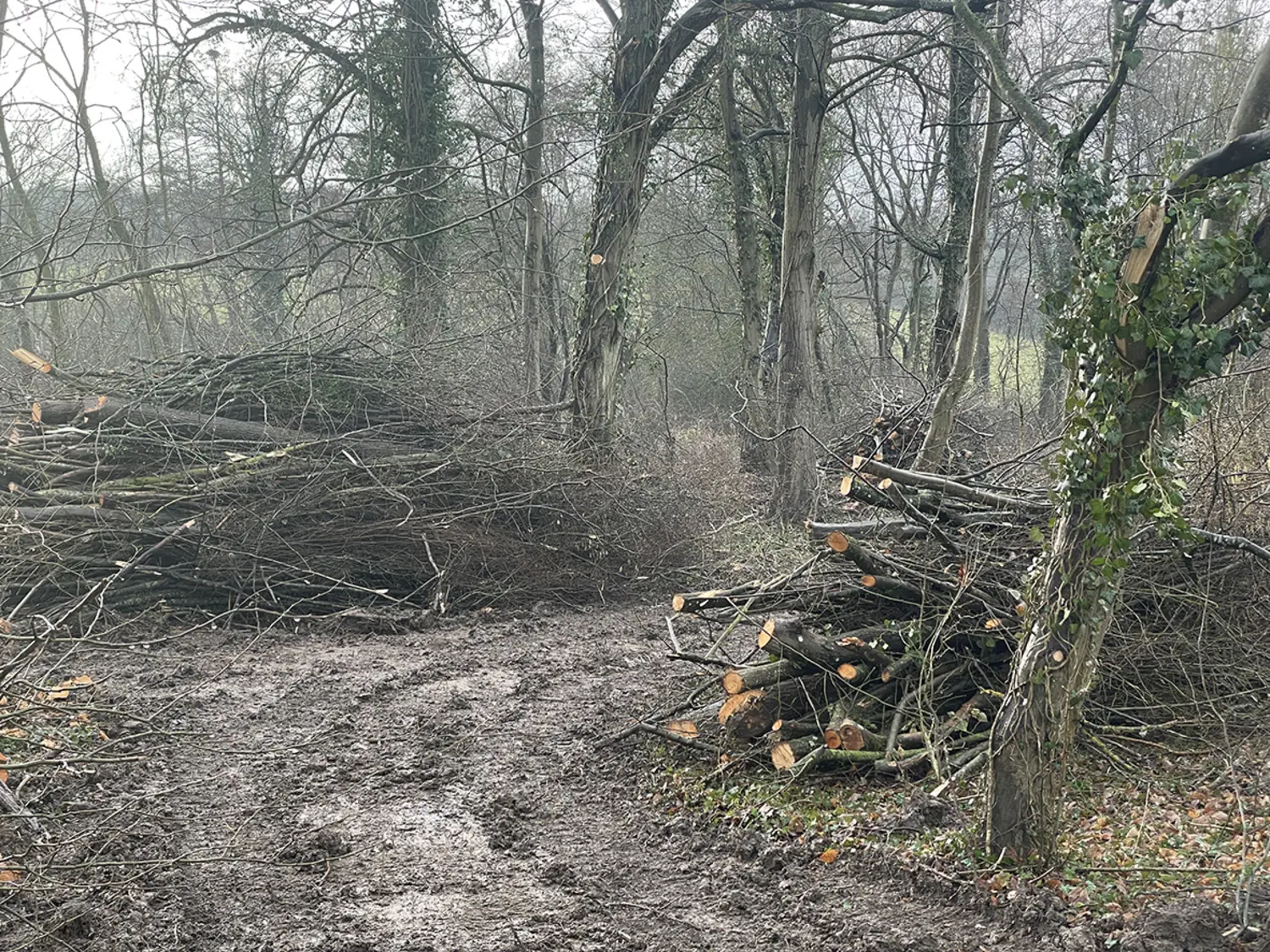 Il s’agit de l’ensemble des arbres du petit bois proche de l’école, le long du ruisselet qui serpente depuis Mey, coupés le mois dernier puis entassés. Le bois sera très prochainement évacué.